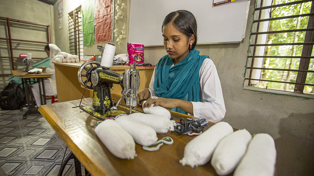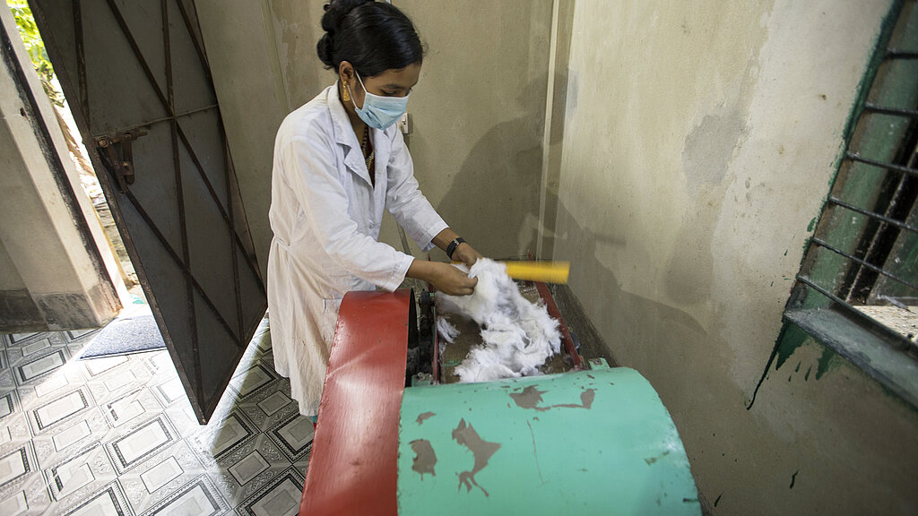 Als die Produktionsstätte eingerichtet wurde, stellte Plan International Lucky die notwendigen Startmaterialien zur Verfügung - eine automatische Plattenmaschine, einen Trockner, eine Baumwollraffineriemaschine, eine Nähmaschine sowie Baumwolle, Gaze und Verbände - und brachte ihr die Bedienung der Geräte bei. "Plan International hat seine Unterstützung auf uns ausgedehnt", erklärt Lucky. "Sie gaben uns alles was wir brauchten, um die Bindenproduktion und den Verkauf starten zu können.